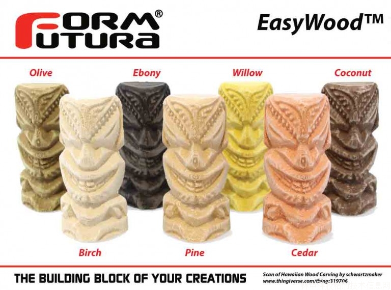 隨著3D打印技術的日漸普及,可用的3D打印材料也日漸繁多。這其中,估計受到人類對木材天然的親近感影響,仿木質屬性的3D打印材料顯得獨樹一幟,受到很多3D打印愛好者以及創客們的喜愛。因此也吸引了很多3D打印線材廠商發布了各種獨特的木質線材產品,總部位于荷蘭的Formfutura公司就是其中之一。