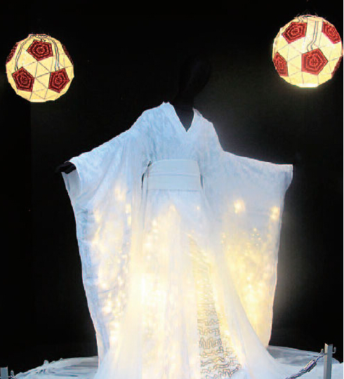 在展會上,該公司展示了使用導電漿料在布料上直接繪制電路,安裝有LED芯片的服裝(圖)*3。發光服裝早已在游樂場、戲劇等領域投入了實用,這類服裝大多是在內部鋪設電線,大多失去了布料的柔軟度。而使用漿料不會破壞布料的柔軟度,只需要“畫線”就可以簡單地繪制電路。