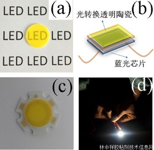 (a)熒光陶瓷片,(b)光轉(zhuǎn)換透明陶瓷封裝示意圖,(c)封裝透明陶瓷的LED燈珠,(d)演示透明陶瓷型LED燈珠白光轉(zhuǎn)換效果。