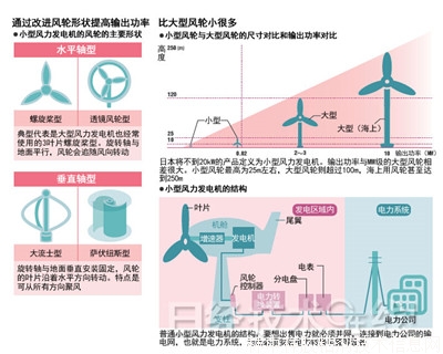 目前,小型風輪與大型風輪的輸出功率相差懸殊,因此小型風力發電不可能成為替代能源。但如果安裝數量增加,小型風力發電機也有望為日本可再生能源提供一臂之力。