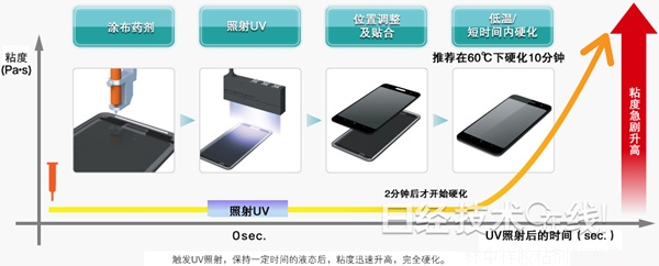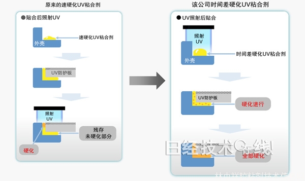 以前的紫外線(UV)固化粘合劑在照射紫外線之后就開始固化,因此要在安裝面板之后再照射紫外線,不適合粘結UV防護型面板。松下此次開發了獨特的樹脂設計技術,新產品在照射紫外線兩分鐘后才開始固化,因此可以在照射紫外線后再安裝UV防護型面板。另外,由于不會立即固化,因此在安裝面板以后還可以調整位置。