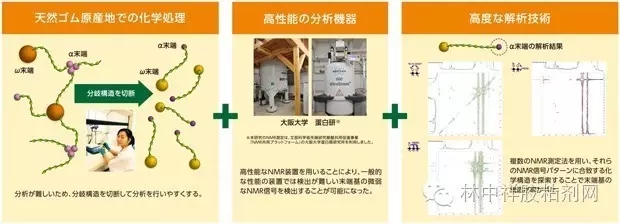 住友橡膠除了在天然橡膠的原產(chǎn)地進(jìn)行化學(xué)處理之外,還使用大阪大學(xué)的核磁共振(Nuclear Magnetic Resonance:NMR)裝置,檢測(cè)出了末端基的微弱NMR信號(hào)(圖1)。并且,還采用多種NMR測(cè)量法進(jìn)行分析,探索出與這些NMR信號(hào)圖形一致的化學(xué)結(jié)構(gòu),并導(dǎo)出了末端基的結(jié)構(gòu)。