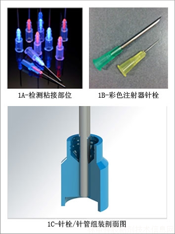 圖1C所示為針管和針栓組裝的剖面圖。不銹鋼針管通常從注射器針筒底端穿過針栓的中心,從針栓用膠粘劑固定針頭的井狀結構出來。針栓的接合長度越長,接點的拉伸強度越大。