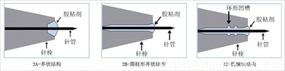 膠粘劑在針栓的井狀結構中固化,將針頭固定住,這種井狀結構的設計可以幫助提高拉伸強度。實際上,最好的設計應當是能讓膠粘劑輕易流延至針管四周,讓針管和針栓表面緊緊地粘合在一起。針栓的井狀結構徑口越寬,膠粘劑的粘接面積越大,膠粘劑也越容易滲入并填充滿井狀結構。井狀結構越深,拉伸強度越大。圖2A所示為常見的井狀結構,針栓穿過末端繼續延伸至針筒。該圖中的井狀結構足夠大,完全可以滿足中等粘度膠粘劑的填充要求。