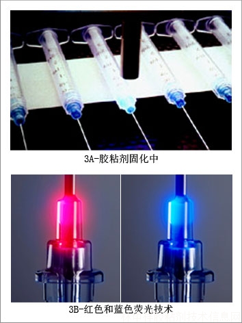 量產注射器時,紫外光/可視光固化膠粘劑的熱固聚體在數秒內固化,粘接金屬和塑料等不同基材。這些單組分膠粘劑在適當的光強和波長的光照下即可快速固化,縮短制造周期。膠粘劑調制時可添加熒光性能,方便檢測粘接處的施膠狀況及用膠量(圖1A)。一些膠粘劑還具有變色性能,生產商通過肉眼觀察即可確認其固化程度。