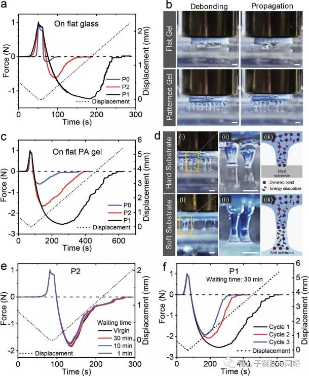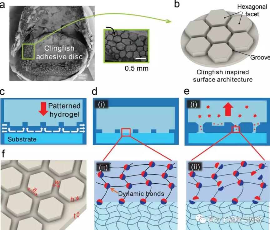 受喉盤魚的吸盤結構(a)的啟發,作者在水凝膠表面設計了由凹槽分隔的六邊形結構(b)。凹槽起到排水通道的作用,以促進六邊形表面在水下與基體的快速接觸(c)。凝膠的六邊形界面上的動態鍵與基質結合以粘附界面。在拉伸過程中,凝膠本體動態鍵的斷裂耗散能量,延緩了界面處的脫粘(d-e)。另外,獨立的六邊形界面防止裂紋在整個界面的連續擴展,也增強了粘附強度和剝離能(f)。