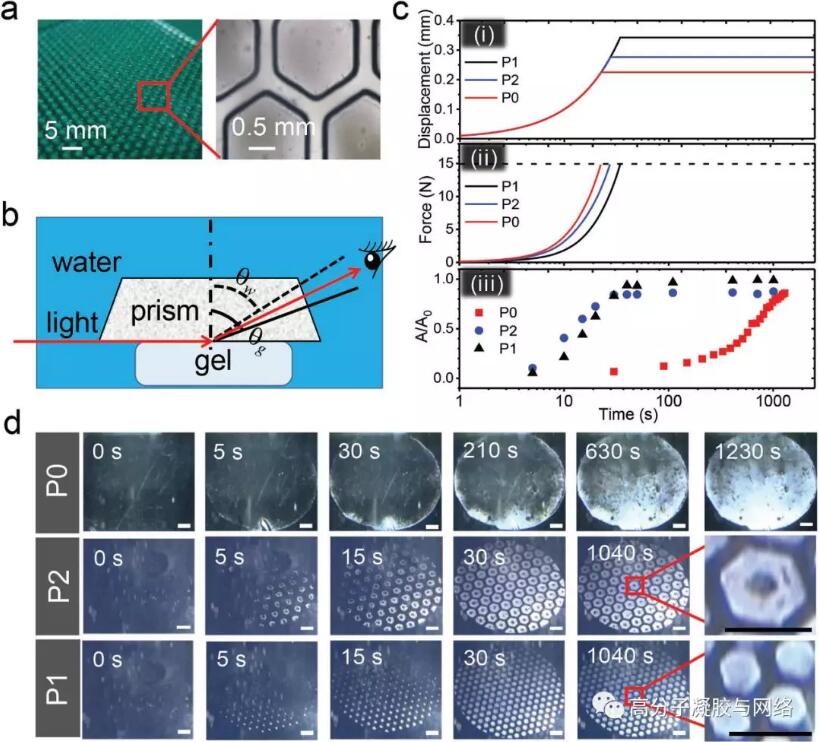 從聚兩性電解質(PA)水凝膠表面結構的光學和顯微鏡圖像(a)可以看出,在凝膠表面上形成了明顯的由凹槽分開的六邊形界面。作者設計了一種可以直接觀察水凝膠與基質接觸過程的裝置(b)并制備了三種凝膠:平面P0凝膠、六邊形邊長為0.875 mm的凝膠P1和六邊形邊長為1.75 mm的凝膠P2,以此驗證該實驗的設計思路。結合位移、作用力及接觸面積比對時間的圖像(c)與接觸過程的照片(d)可看出,P0凝膠與玻璃的接觸從外圍開始,然后逐漸不規則地發展到整個區域。受力在22 s后迅速達到預設值,然而此時凝膠幾乎不與玻璃接觸,表明界面處的水還未被排出,即使在1000多秒后,照片中的一些區域仍然保持黑暗,同時許多黑點分布不均勻,表明出現了永久的“鎖水”。另一方面,P1和P2凝膠的接觸過程在30-40 s內就已完成。1000 s后,P2凝膠的六邊形界面中心任然保持黑色,說明出現了“鎖水”,而P1凝膠則沒有此種現象。這一現象說明對于PA凝膠-玻璃體系,其出現“鎖水”的臨界六邊形邊長在0.875-1.75 mm之間。
