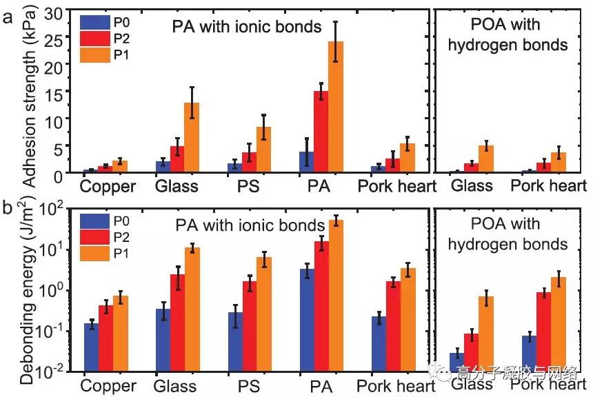 從粘附強度(a)和剝離能(b)的柱狀圖可看出,凝膠對不同的基質表面都表現出粘附能力,P1凝膠的粘附強度和剝離能最高分別為25 kPa和50 J/m2。同時,采用氫鍵做可逆鍵的POA凝膠在玻璃和生物組織表面也表現出較好的粘附。
