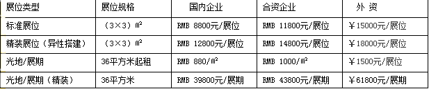 ※注:標(biāo)準(zhǔn)展位:三面圍板(2.5m高)、地毯、楣板、射燈二支、洽談桌一張、椅子二把220V插座一個。